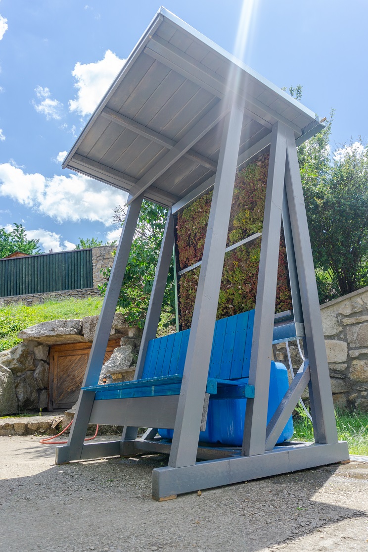 Zatímco čerpadlo poháněno solárním panelem zavlažuje retenční desku STERED s vegetačním porostem od firmy ARBOR, následně odpařená voda vytváří příjemné, zvlhčené a výrazně chladnější okolní prostředí.